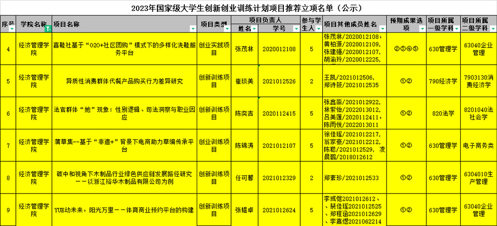2023年国家级大学生创新创业训练计划项目推荐立项名单(公示)
