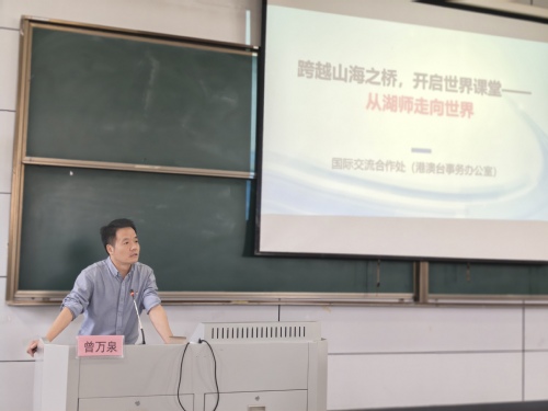 曾万泉老师以“跨越山海之桥,开启世界课堂——从湖师走向世界”为主题,结合自身深耕国际交流领域的丰富经验,从国际文化交流的时代意义、高校国际交流资源优势、学生参与国际项目的路径方法三个维度展开分享。他用生动案例介绍了学校各类国际访学、交换生、跨国学术论坛等项目的特色与申请要点,详细解读了参与国际交流对个人成长、学术提升及职业发展的重要价值。