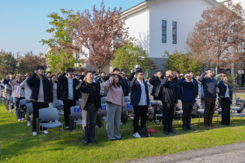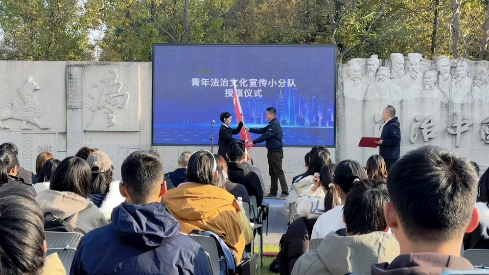 仪式现场,湖州师范学院沈家本法学院副院长谢舟首先致辞;随后,文化园负责人张勇向我院谢舟、牛彬彬老师颁发顾问聘书,吴兴区司法局局长孙斌义向湖师法援学生代表授予“青年法治文化宣传分队”旗帜,学生代表带领全场庄严宣誓,誓言在法治文化地标上空回响。