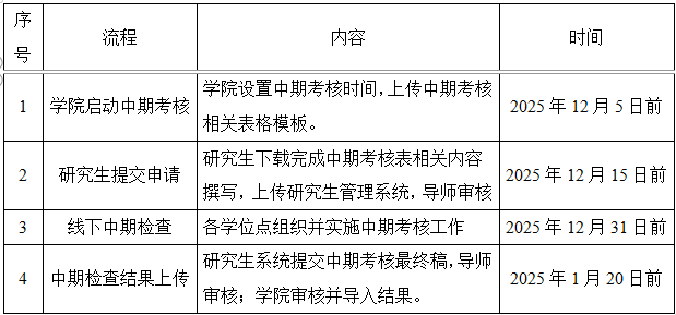 为进一步加强研究生培养过程管理,落实研究生培养的目标,现开展2023级研究生中期考核,通知如下: