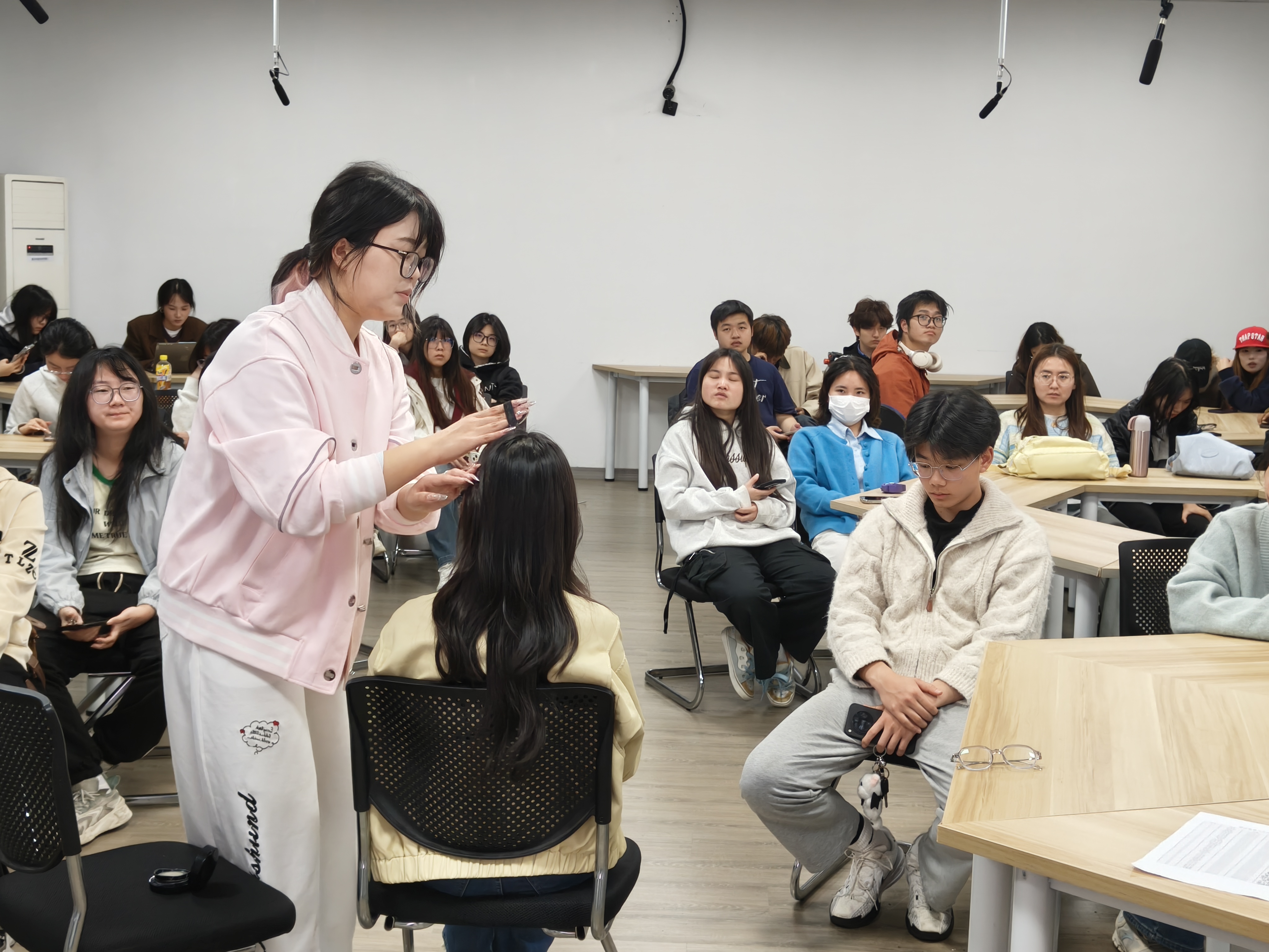 活动伊始,学院资助负责人老师陈维奇围绕学校资助政策进行全面解读,就各类奖助学金等申请条件、评审流程与注意事项作细致讲解,帮助同学们清晰掌握政策要点。他勉励全体受助学生珍惜学习机会,心怀感恩、勤学笃行,积极参加校内外各类实践和实习活动,不断提升专业能力与综合素质,以优异成绩回报学校与社会的关怀。随后,研究生沈怡聚焦职业礼仪开展专题分享,从职场沟通、仪容仪表、以及社交礼仪等方面进行系统讲解,通过实用案例让同学们直观掌握职场礼仪规范,帮助大家树立良好职业形象,提升职场适应力与软实力。最后,研究生邹蕾结合自身实习经历,带来职业妆容实操展示,围绕职场场景的妆容原则进行现场演示与技巧教学,内容简洁实用、贴近求职需求,让同学们快速掌握得体、大方的职业妆容方法,以更好的精神面貌迎接面试与职场挑战。