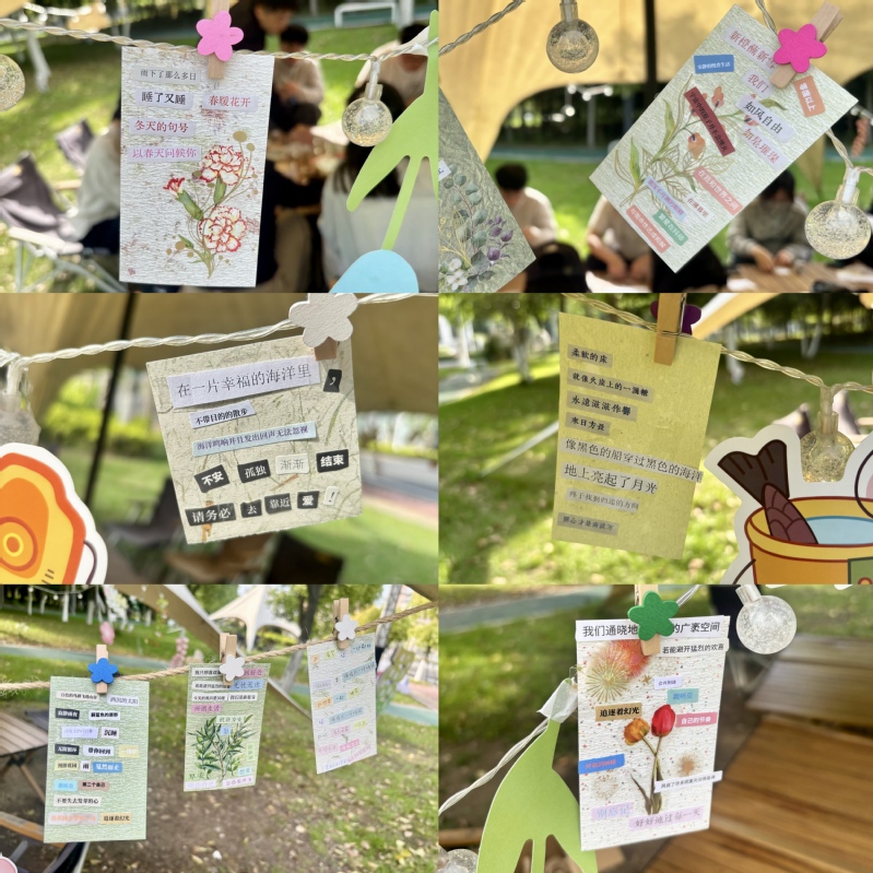 在春日暖阳中,大家从准备好的旧报纸、过期期刊、彩色卡纸以及专门印制的“情绪词库”中挑选字词、短句和图像。大家通过剪裁、拼贴、重组,将碎片化的文字与春日意象结合,创作出一首首独具个性的拼贴诗。有的作品表达了成长中的迷茫与希望,有的则记录了当下生活的温暖瞬间。这一环节不仅让同学们体验了如何通过文字解构与重构来梳理内心,更为他们未来在班级中开展创意心理主题班会提供了可复制的范本。